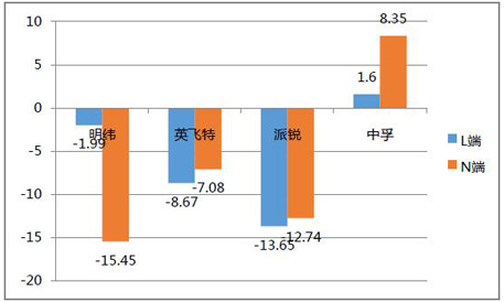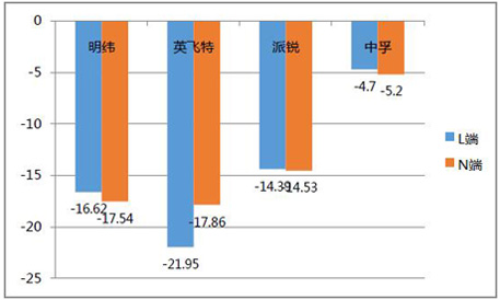 此次樣品功率大于25W,根據(jù)國(guó)際標(biāo)準(zhǔn)EN55015相關(guān)標(biāo)準(zhǔn)進(jìn)行測(cè)試。從最大限度降低傳導(dǎo)干擾強(qiáng)度的角度來看,英飛特樣品設(shè)計(jì)方案最優(yōu)。