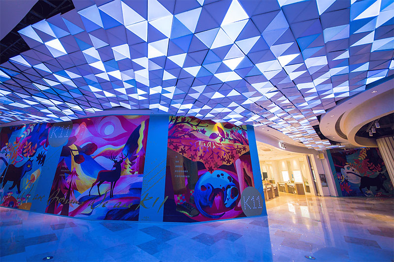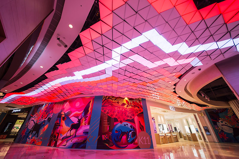 整個藝術(shù)作品是由1,500 塊等大的三角形燈片構(gòu)成,每個燈片的傾斜角度及離地高度不同,3 米寬、31 米長如海浪般的曲線造型懸掛在天花板上。流動的波浪中安裝著可以變換1,680 萬種顏色和圖案的LED 燈光設(shè)備,所有顏色的變化與效果可通過計算機(jī)程序控制,通過改變每一個燈片的顏色組成各種形態(tài)。