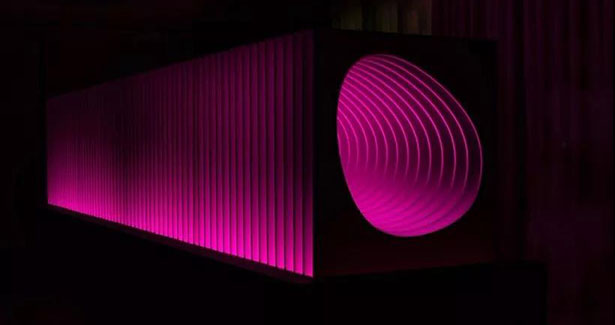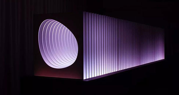 裝置采用PORCELANOSA group 新一代材料krion?制作而成。這個沉浸式雕塑利用燈光、形態(tài)以及透視關(guān)系進行實驗,整個裝置包含64個固體材質(zhì)制成的片狀結(jié)構(gòu),搭配動態(tài)燈光,共同營造出獨特的視覺體驗。