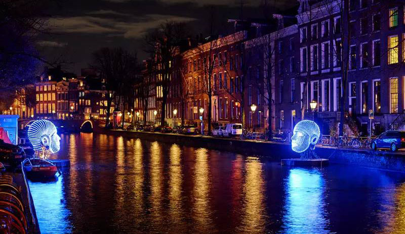 或許,阿姆斯特丹燈光節(jié)(Amsterdam Light Festival)是唯一一個能夠讓游客在船上徜徉、體驗藝術(shù)的燈光節(jié)。阿姆斯特丹燈光節(jié)在冬天拉開帷幕,一般在11月至12月開始,來年的1月結(jié)束,時間持續(xù)近兩個月。燈光節(jié)既有步行路線,又有獨特的乘舟路線。夜間,在船上,游客能夠看到被燈光裝點的河畔建筑,“航行”中提供的咖啡,則能夠驅(qū)散冬日的寒冷。