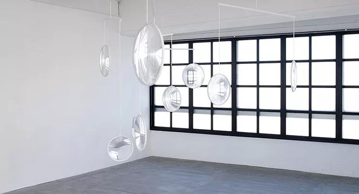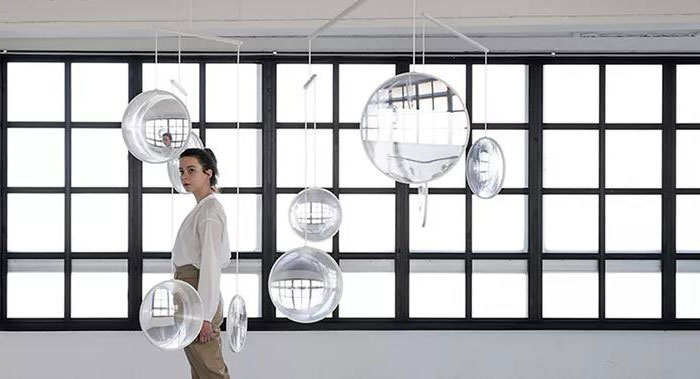 “focus”是一個多方向的空間裝置,它以不同角度朝向周圍環(huán)境,創(chuàng)造出一種持續(xù)變化的感知空間。一系列扁平而輕質(zhì)的透鏡被懸掛于屋頂,全方位地捕捉、收集并散射著來自窗外和室內(nèi)的光線。與此同時,這些鏡面還反映出四面八方的風景,創(chuàng)造出一系列嵌入“光圈”中的浮動世界。