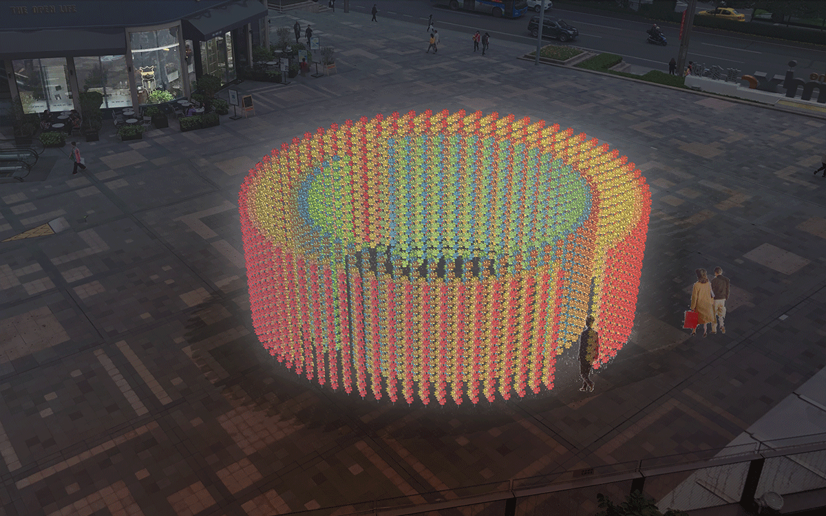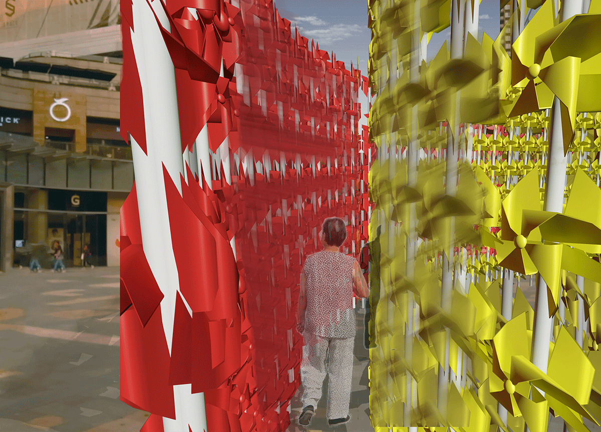作品以風(fēng)車為元素,通過不斷地復(fù)制疊加形成了兩個(gè)圓形結(jié)構(gòu)體。風(fēng),客觀存在于宇宙,但卻又看不見摸不著,只能感受。我們想以風(fēng)車為媒介,營造出一種人、風(fēng)、場三者間的互動(dòng)。當(dāng)人經(jīng)過,風(fēng)車便會轉(zhuǎn)動(dòng)起來,風(fēng)車轉(zhuǎn)動(dòng),然又會發(fā)出“呼呼”的聲音,這就是風(fēng)呼吸的聲音。轉(zhuǎn)動(dòng)的風(fēng)車象征著生命富于活力,流轉(zhuǎn)不息, 這種視聽覺空間體驗(yàn)給人帶來無限的遐想和憧憬。