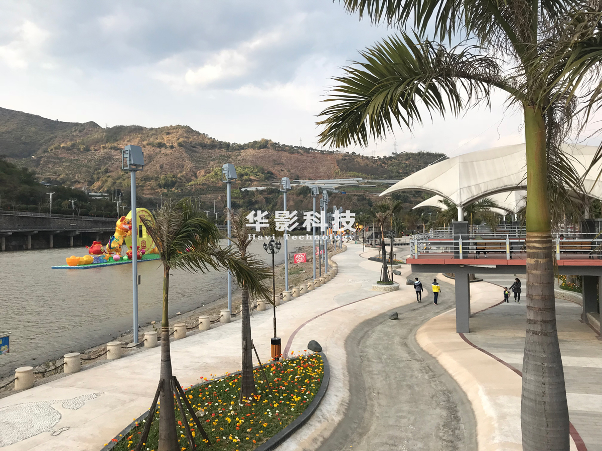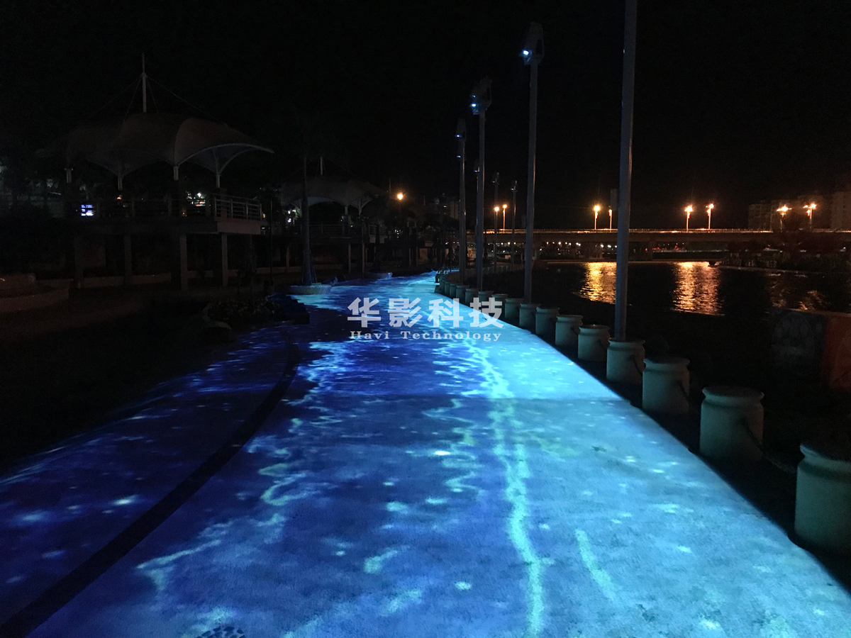 音樂和音效的配合下,地面上陸續(xù)播放不同的影片,呈現(xiàn)出波濤洶涌的海浪、繽紛花朵以及豐富的海底世界等特效。3D投影畫面設計逼真生動,給人以神奇的視覺、聲覺、感覺體驗。