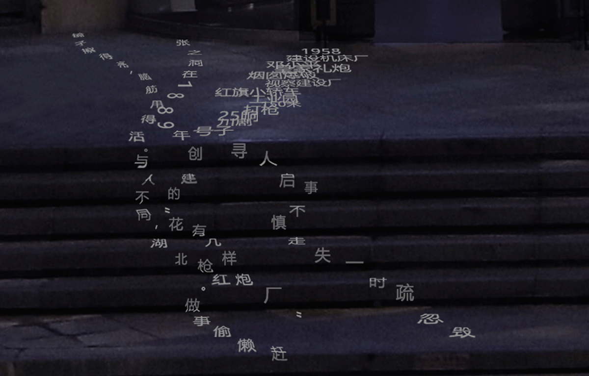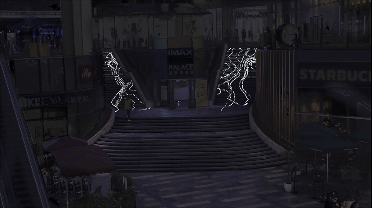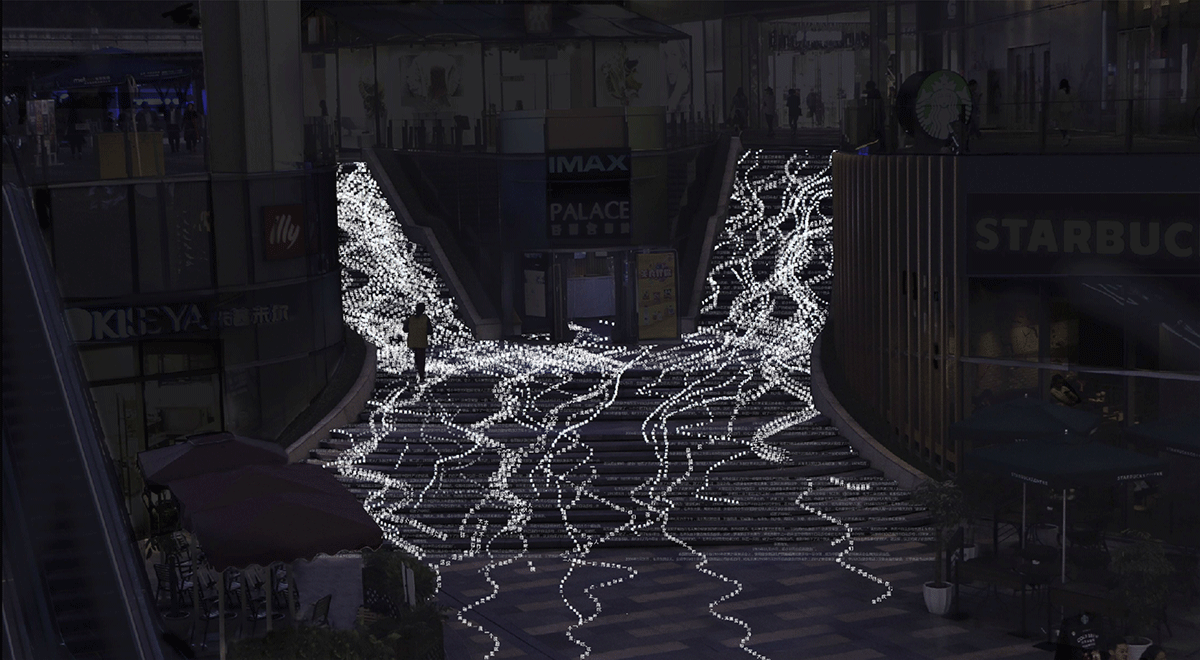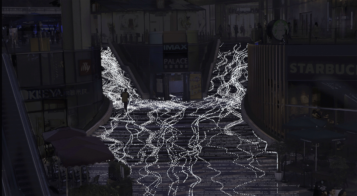 通過(guò)河流的形式,將當(dāng)?shù)匚幕?、?chǎng)所歷史、生活趣事、方言以及小故事等信息展現(xiàn)在公眾眼前。在公眾進(jìn)入到“河流”區(qū)域時(shí),水流就會(huì)像遇到石頭般分散而流,增進(jìn)了公眾與裝置的互動(dòng)性,人群與場(chǎng)所相融合,從而產(chǎn)生趣味性,能夠在體驗(yàn)與觀賞間帶給公眾一種文化的沖擊。