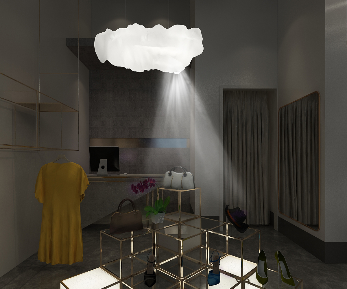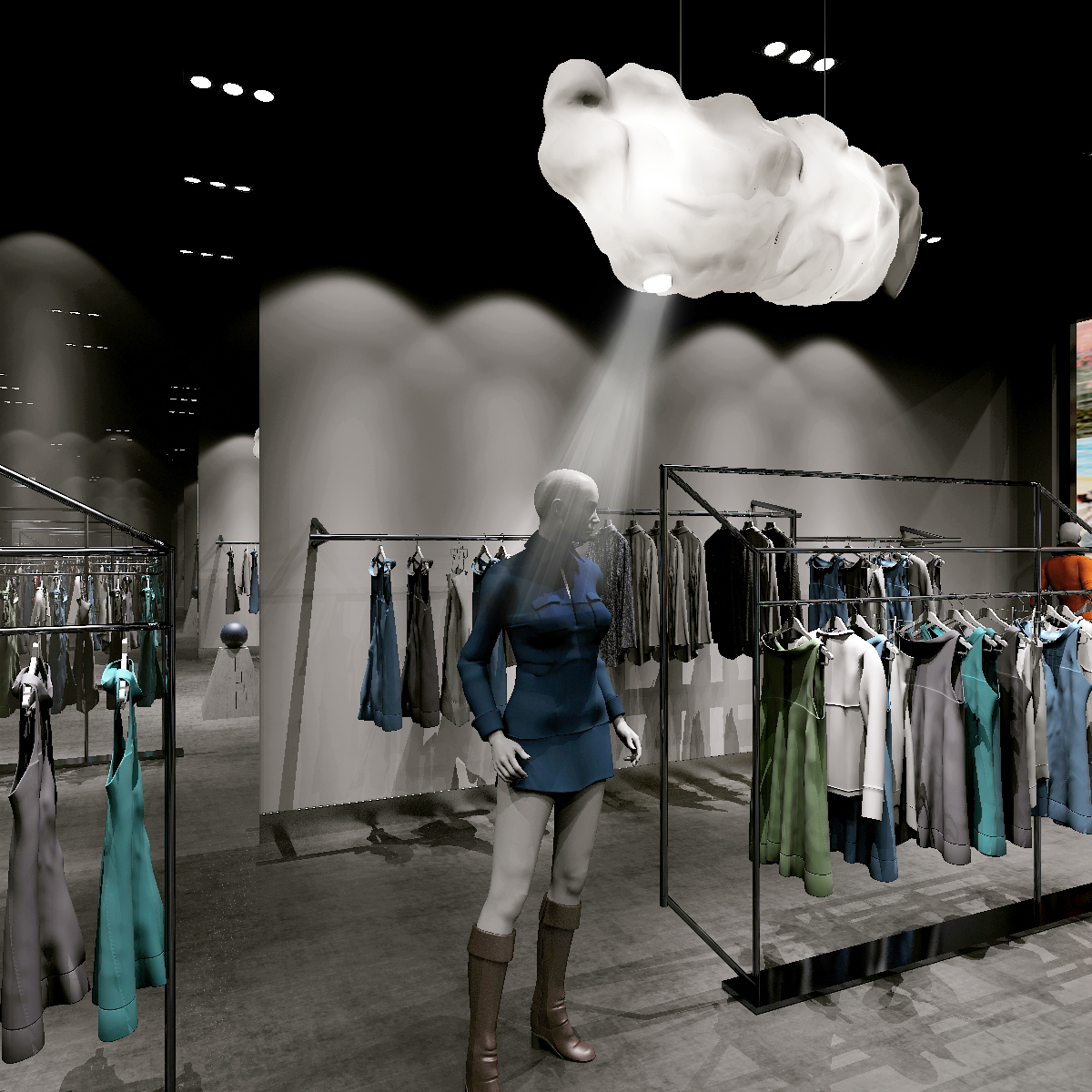 本設(shè)計為服飾售賣空間而作,從服飾中提煉羊毛氈材質(zhì)制作為燈具的外燈罩,體現(xiàn)燈具與服飾融為一體,材質(zhì)上相互呼應(yīng)。燈具本身是個不規(guī)則的形狀,提高了往常售賣空間燈具的裝飾感。報廢的燈具又可以做成裝飾品,羊毛氈是不會受損的材質(zhì),卸下燈具又是一個很好的做裝飾品的材料。 燈具采用LED光源,光源可靠性強發(fā)熱量低,無熱輻射性,使用壽命長,體現(xiàn)了燈具的可持續(xù)性。燈具本身是個散光光源,具有照亮空間的作用,這個是基礎(chǔ)照明,突出的射燈又是一個聚光光源,可直射在物體上使其成為焦點,這個是重點照明。從亮度上講,重點照明是基礎(chǔ)照明的3-6倍。優(yōu)質(zhì)的照明能夠激發(fā)情緒和感覺,進而加強商店的品牌。